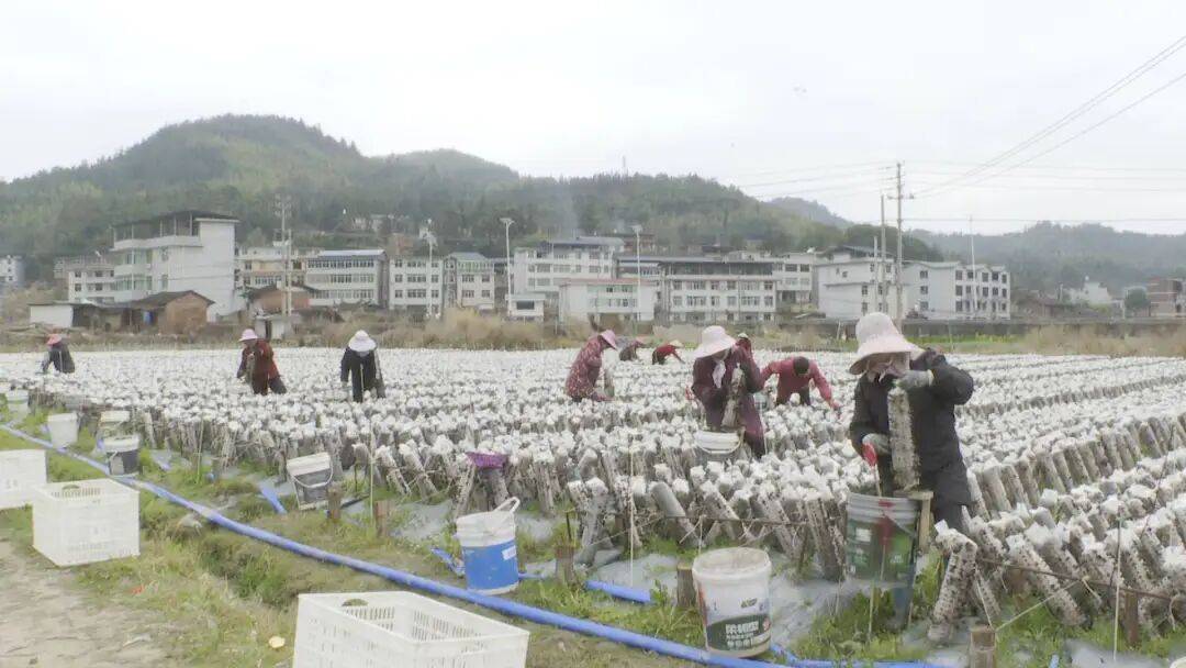 在元沙村黑木耳轻简化技术集成示范基地,村民们穿梭在菌棒间,将一朵朵鲜嫩的木耳小心采下,装筐、搬运,现场一派繁忙的丰收景象。