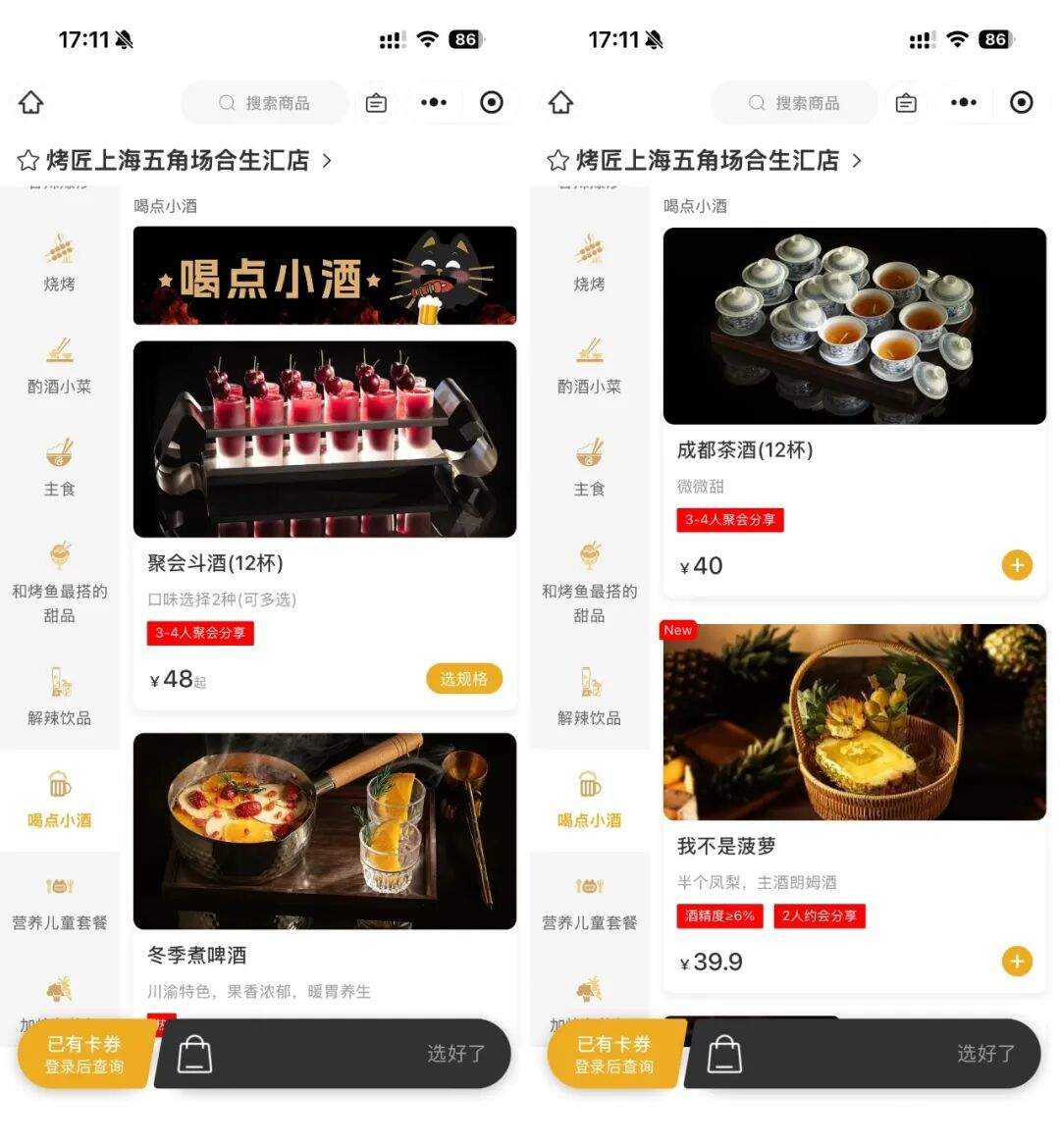 产品方面,推出年轻人喜爱的烧烤、下酒菜、酒饮等夜宵产品。以酒饮为例,除了常见的精酿啤酒等产品,还围绕年轻人的“入口性好”“小酌没压力”等需求,推出了“聚会斗酒”“成都茶酒”“冬季煮啤酒”等特调饮品。