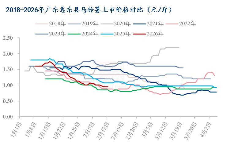 南方冬作区马铃薯新薯自1月初上市以来,价格高开低走,以广东惠东产区为例,截至2月12日春节前交易收尾状态,目前“荷兰”系列75克以上收购价0.90-1.00元/斤,较上市之初开秤价格已累计下滑0.60-0.70元/斤,目前价格仅小幅高于2024年和2022年同期,却明显低于2018-2021年以及2023年和2025年同期。